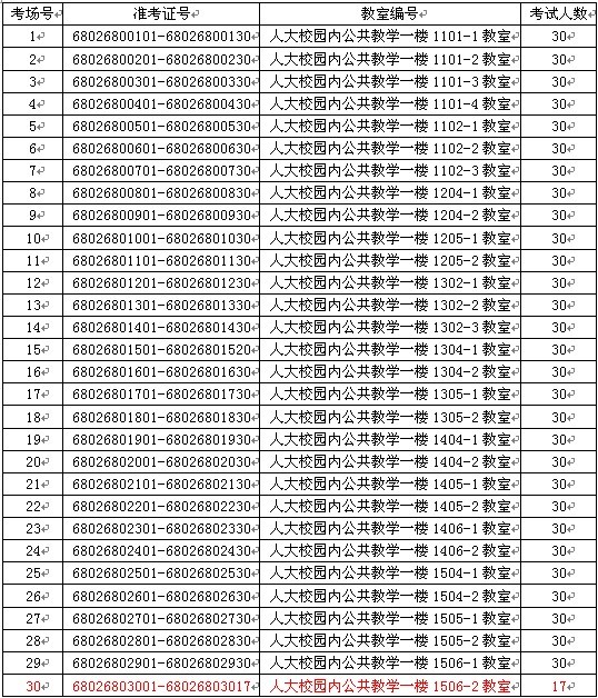 北京201205批次學位英語考試考場安排明細
