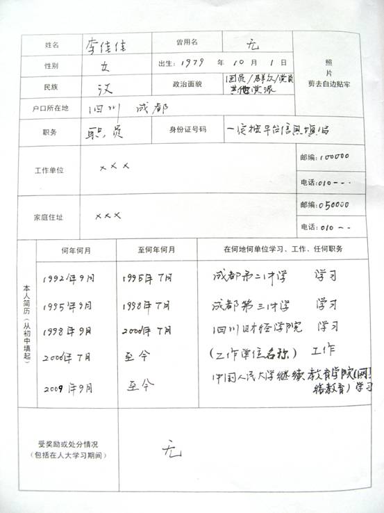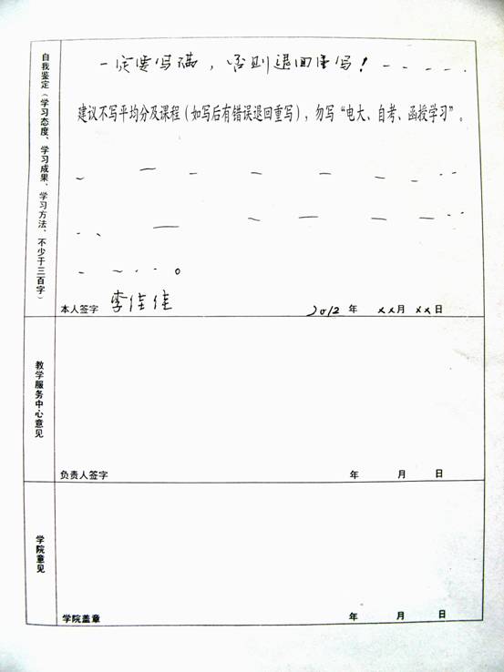 3、在《畢業(yè)生登記表》中需填寫“自我鑒定”(包括學(xué)習(xí)態(tài)度、學(xué)習(xí)成果、學(xué)習(xí)方法,不少于300字)及從初中開始的個人簡歷,請事先準(zhǔn)備好。