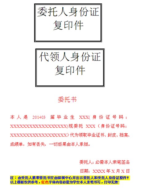 如需委托他人代領(lǐng),必須出示本人及代領(lǐng)人身份證原件,以及由本人親筆書(shū)寫(xiě)的委托書(shū)。(委托書(shū)內(nèi)容包含:本人及代領(lǐng)人身份證復(fù)印件、在復(fù)印件空白處由本人親筆書(shū)寫(xiě)的委托內(nèi)容。)屆時(shí)由深圳中心留存。特別提示:檔案已密封,請(qǐng)同學(xué)們妥善保管切勿私自拆封!