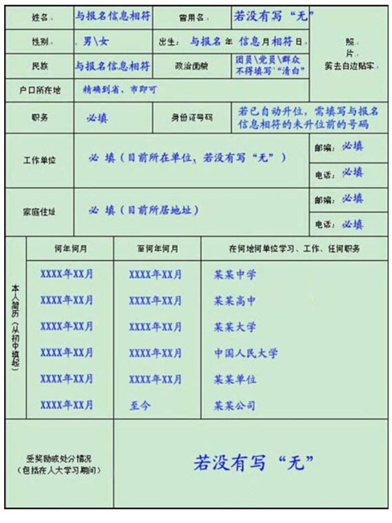 四、政治面貌一欄只能填寫群眾、中共黨員、中共預備黨員、團員,不能填寫“清白”二字;