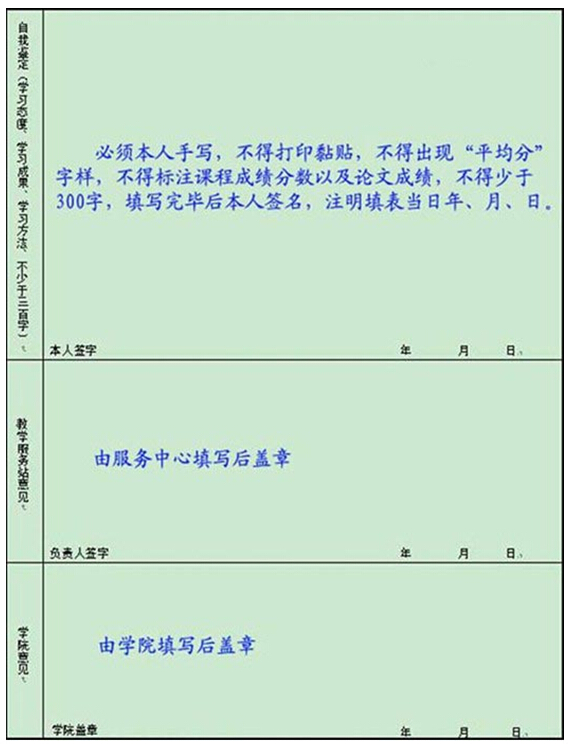 二、請提前撰寫好字數(shù)不少于300字的的“個人鑒定”,根據(jù)在學院學習期間的態(tài)度、成果、方法等方面來總結(jié)。個人鑒定必須手寫,不能粘貼打印稿;