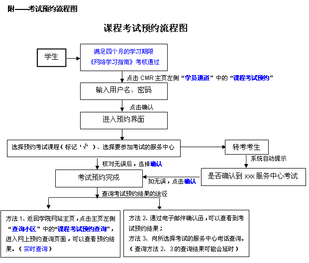 3) 考試時必須攜帶學生證和身份證參加考試,若學生證丟失或正在辦理中,則必須到所屬服務中心開具《學生身份證明》,持此證明和身份證參加考試。具體辦理辦法可向所屬服務中心咨詢。 - 預約流程 (附:課程考試預約流程圖)